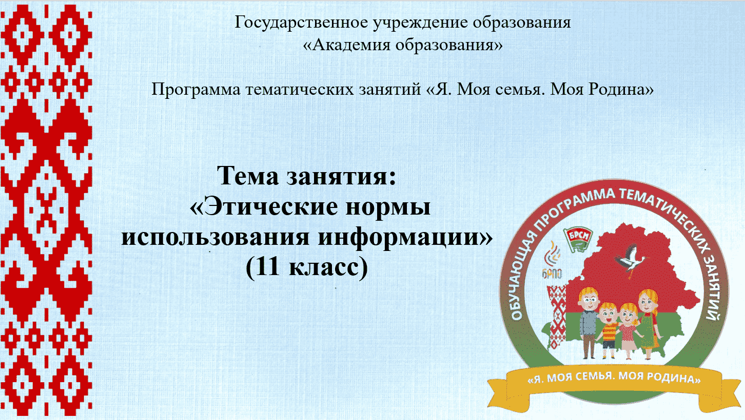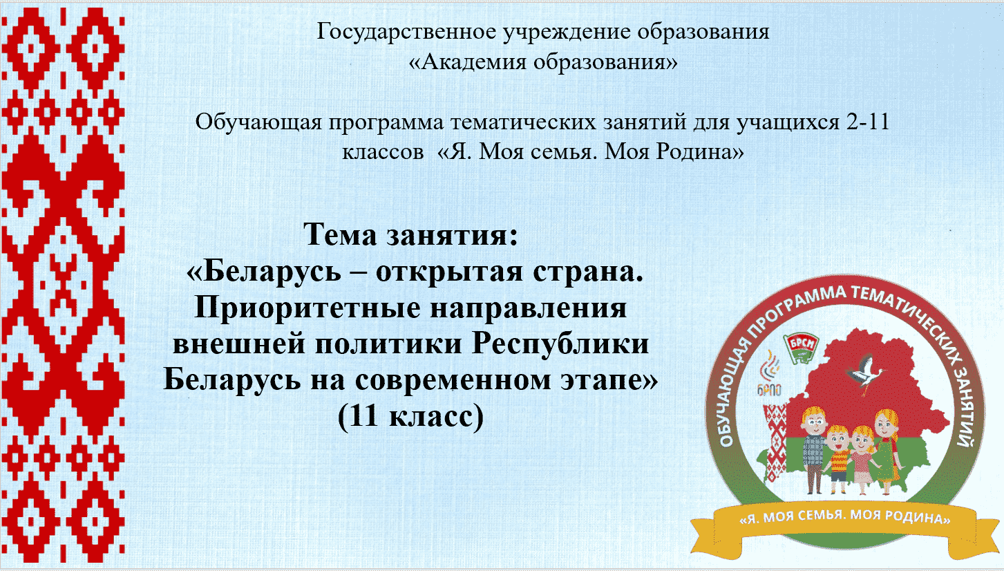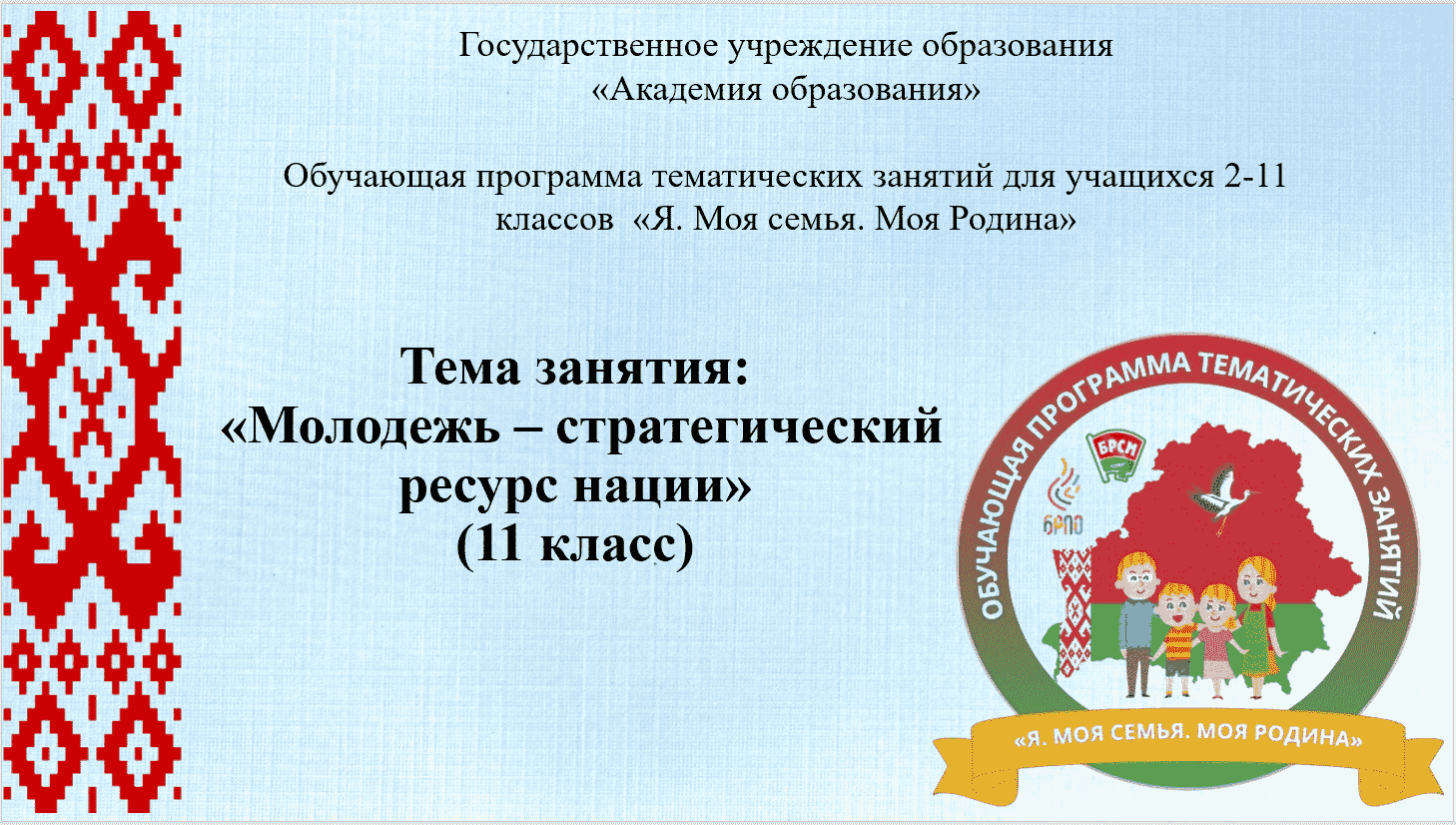 В воспитательном процессе в учреждениях общего среднего образования с целью повышения эффективности идеологического, гражданского, патриотического, духовно-нравственного и семейного воспитания к началу 2025/2026 учебного года в Академии образования была разработана обучающая программа тематических занятий для учащихся II - XI классов «Я. Моя семья. Моя Родина»